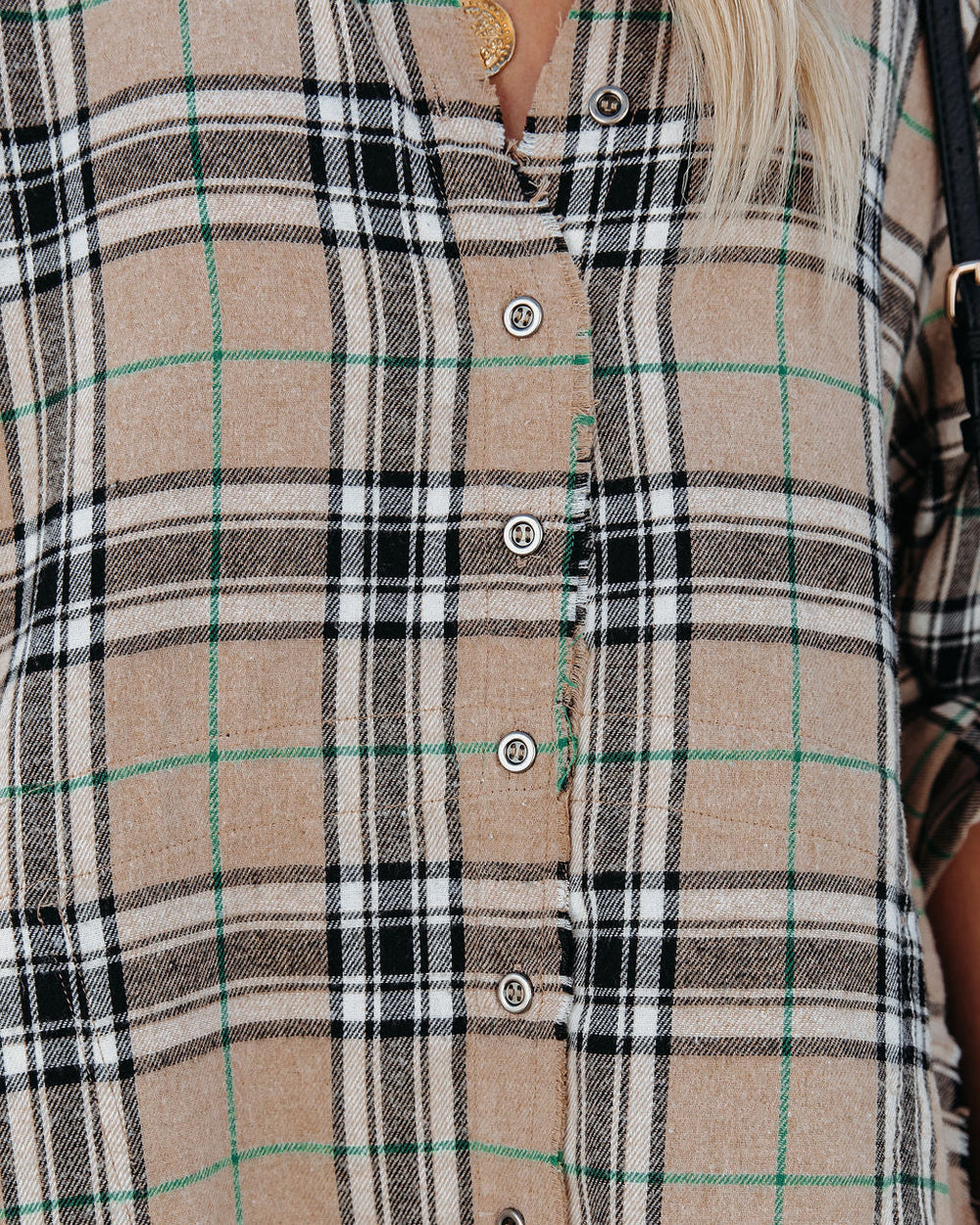 Our Tucker Cotton Blend Pocketed Plaid Button Down Tunic pairs best with OTK boots! Beige. black. ivory. and kelly green hues make up this tunic. Designed with side pockets and frayed edges. Styled with the El Dorado Hat. Tahiti Hoops. Monte Carlo 3.0 Necklace. The Buddha Wheel Necklace. Simple Bangle Bracelet. Allie Tassel Bucket Bag. and Saint Slouch Boot.