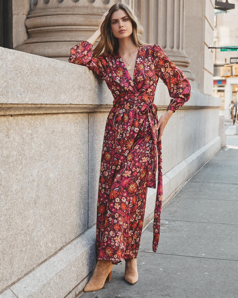 //InsStreet Exclusive// Major Stevie Nicks vibes in our Village Views Floral Wrap Maxi Dress! Rust. brown. purple. pink. coral. lime. blush. grey. orange. and fuchsia florals make up this true wrap maxi. Designed with an adjustable waist tie. Styled with the El Dorado Hat. French Twist Hoops. Emperor Coin Necklace. On The Fly Crossbody Bag. Walford Cropped Fringe Faux Suede Jacket. and Dev Faux Suede Heeled Bootie.