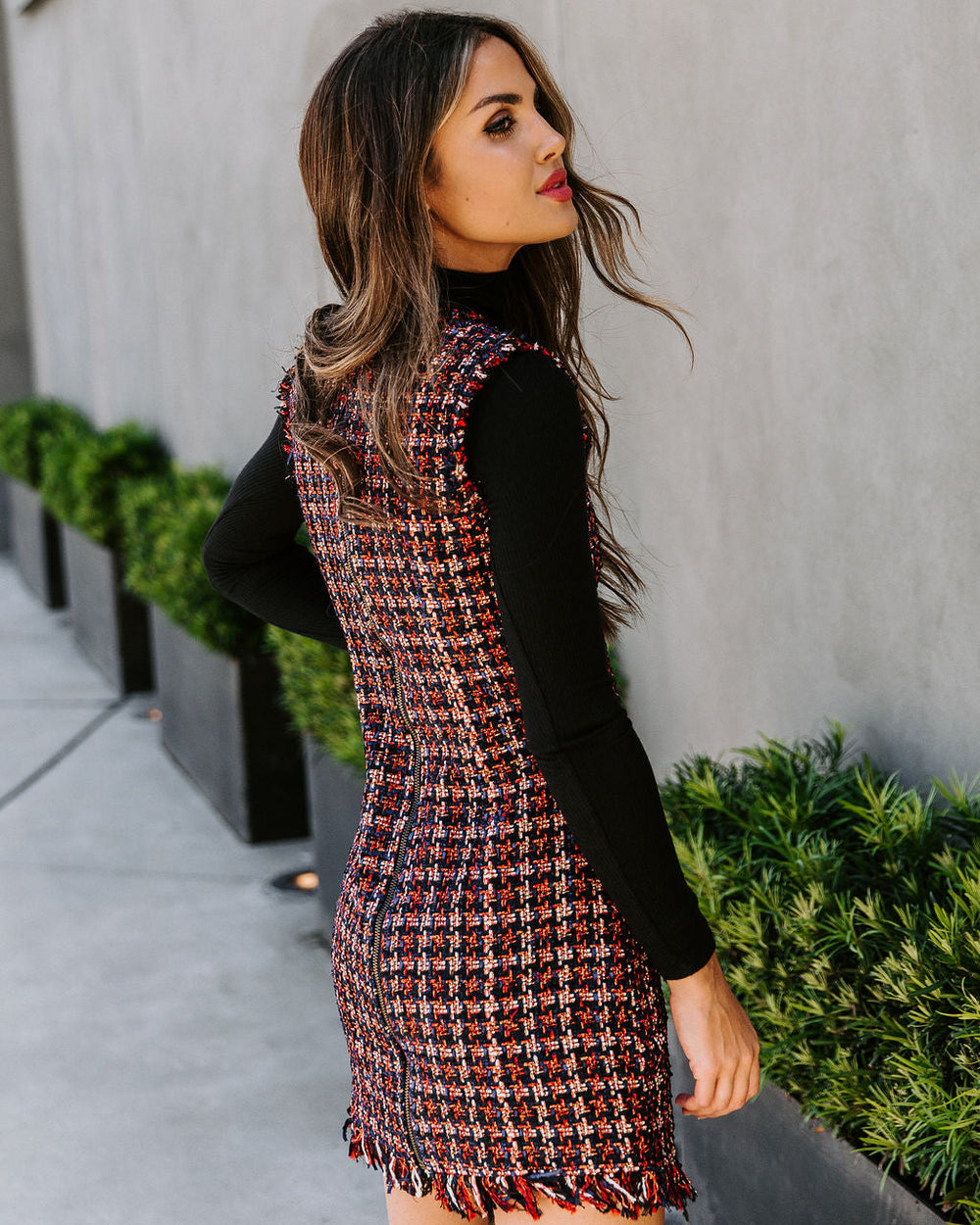Listen closely to our Words Of Wisdom Tweed Mini Dress! This edgy mini puts a modern twist on a classic tweed style. Crafted with black. rusty red. white and gold metallic threads on a navy blue base. The sleeveless true to size fit wears with a round neckline. front faux flap pockets and fringe trim throughout. Finished with a full lining and exposed back zipper.