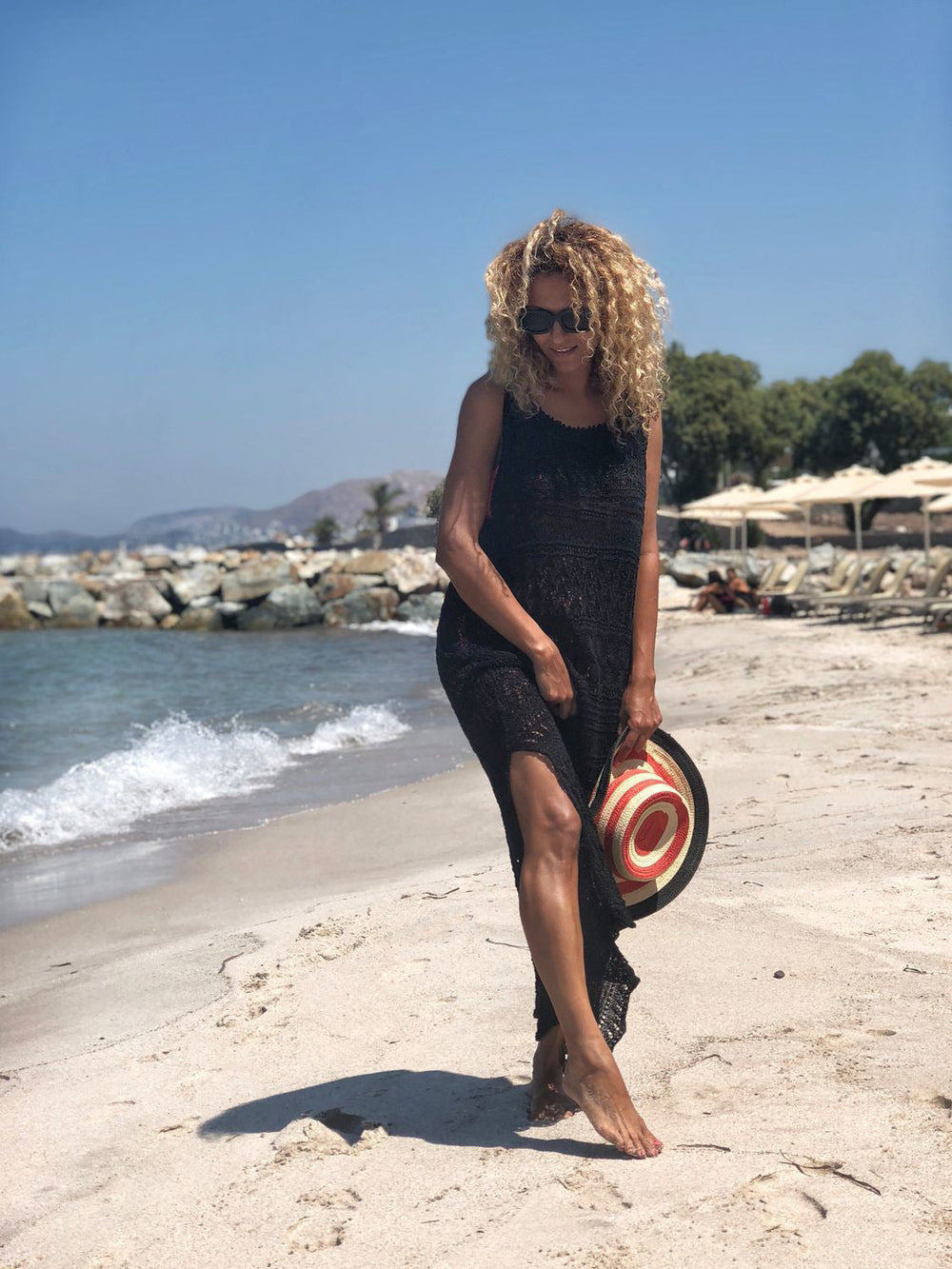 The chicest cover up on the market! Our Yuka Crochet Cover-Up Midi Dress comes in a black sheer style. Designed with a wide neckline and a scooped back. Wear this piece over your favorite one piece! Styled with the Kit Straw Hat. Wellness Layered Pendant Necklace. Initial Card Necklace. Stella Crossbody Envelope Zip Clutch. Bronzed Ribbed Scoop One Piece. and Chantal Square Toe Sandal.