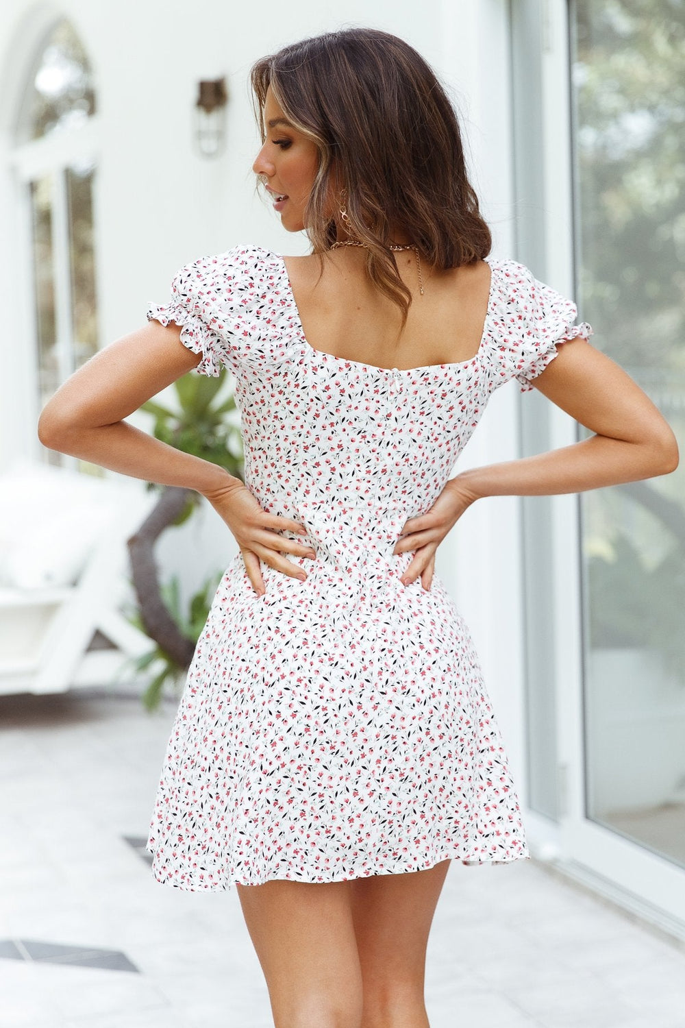 Get In a spring state of mind in the Zarena Printed Babydoll Dress in taupe and grey florals with a split neckline.